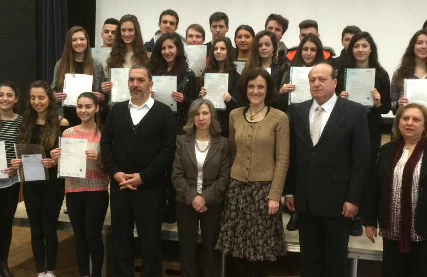 Theresa Villiers, MP for Chipping Barnet and long time campaigner for justice for Cyprus, visited Manor Hill Greek School yesterday to present GCSE and A level certificates to successful students. The event took place at the Totteridge Academy in Barnet Lane which is where Manor Hill School is based on Saturdays and around 500 parents, children and teachers were present. Guests of honour included the head of Cyprus Education Mission in the UK, Maria Papalouka.