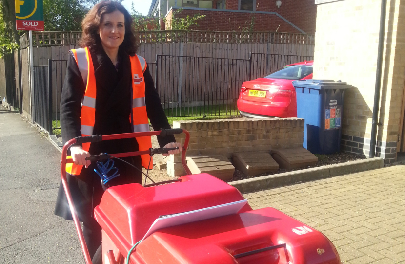 Theresa Villiers MP, for Chipping Barnet, experienced at firsthand what is involved in delivering the post when she joined local postwoman, Claire Stainton, on her delivery round in York Road and other streets in New Barnet today.