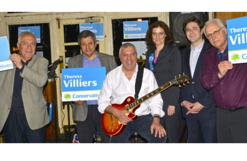 On the eve of the launch of the Conservative manifesto, Theresa Villiers, Conservative candidate for Chipping Barnet, attended an event hosted by members of the Greek Cypriot community. The evening of music was held at the Cypriot-owned Cavalier pub, in Russell Lane N20, and the renowned musician, Nikos Savvides, sang many songs about Cyprus and reminisced about life in Famagusta before the 1974 invasion.