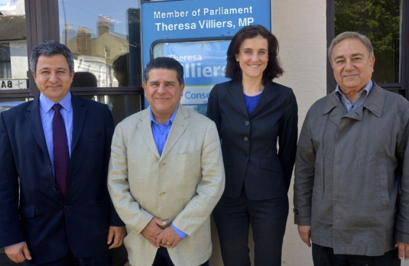 Theresa Villiers, MP for Chipping Barnet, met with important figures of the Greek Cypriot Community: Tony Yerolemou, President of the Greek Cypriot Brotherhood, George Mouskas, President of the Cyprus Union of Ship owners, Andreas Papaevripides, President of the World Federation of Overseas Cypriots, and Doros Partasides, member of Chipping Barnet Conservative Association, for their annual informal meeting in Barnet.